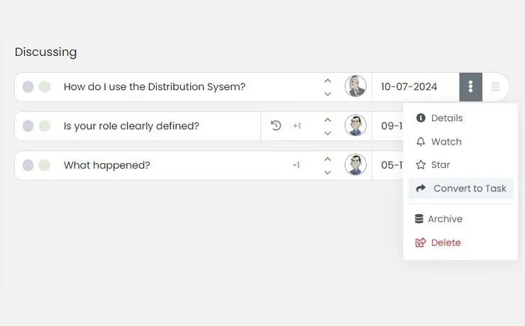 Use discussion topics to ideate. Convert that discussion to a Task the moment there’s a solution. Now it’s owned, dated, and trackable.