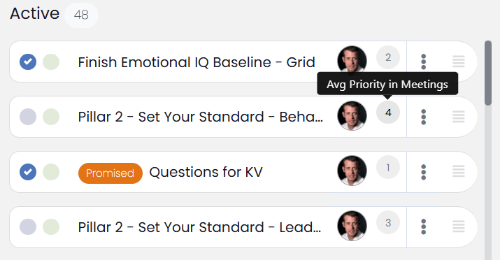 Filter by owner, meeting, project, or due date to focus the day. See promised items front-and-center to keep commitments visible.