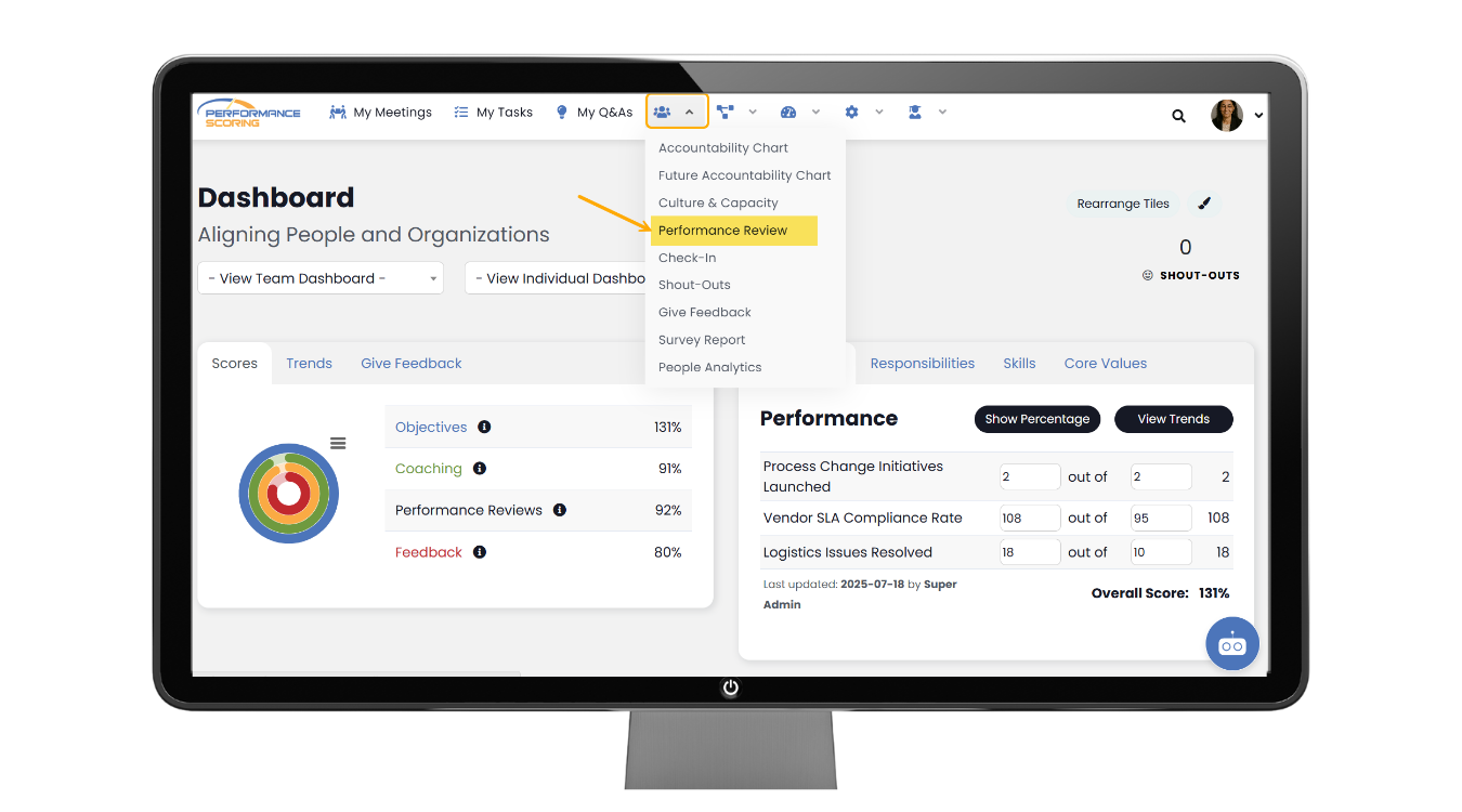 Performance reviews in Performance Scoring are designed to be clear, structured, and data-driven — not awkward or overwhelming. The platform brings together metrics, core values, feedback, and role expectations so conversations stay focused and productive.