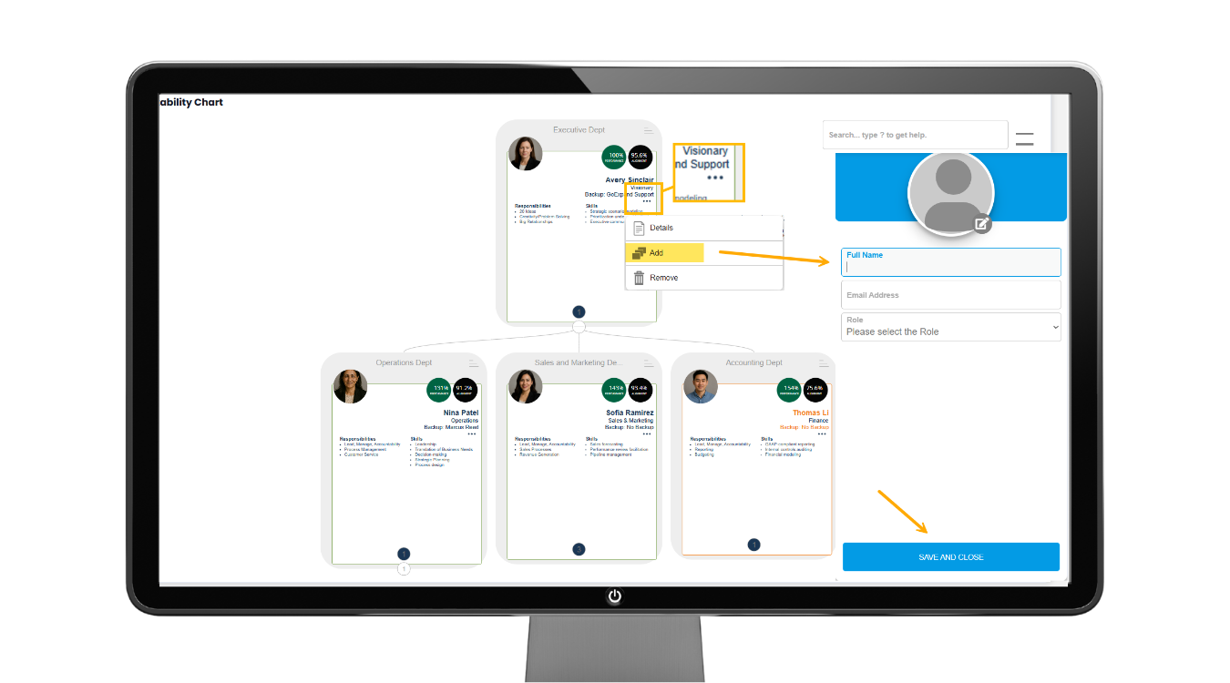 - Enter the employee’s information, assign their role and seat, and save your changes – this ensures the Accountability Chart stays accurate while seamlessly adding the new user to your organization.