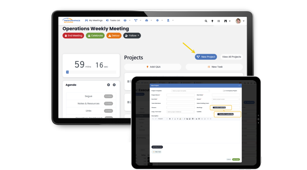 There are two ways to add a Project to a meeting: adding a Project to an existing Task and creating a Project from scratch within a meeting.