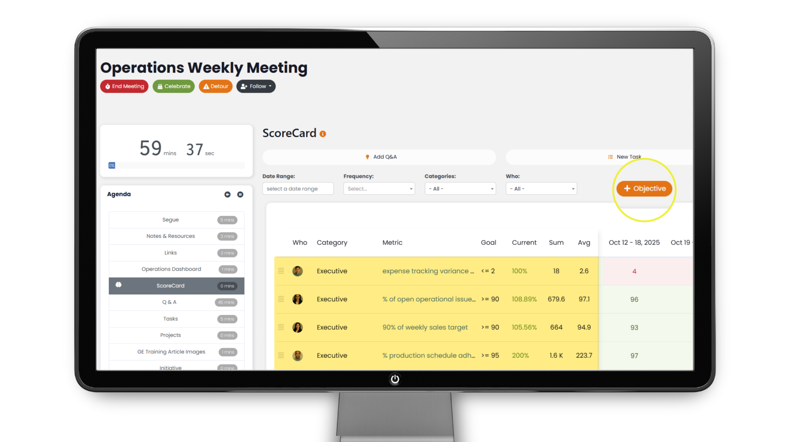 Objectives or Objective Categories are added to your meeting agenda; you’ll see a new agenda item called ‘Scorecard’