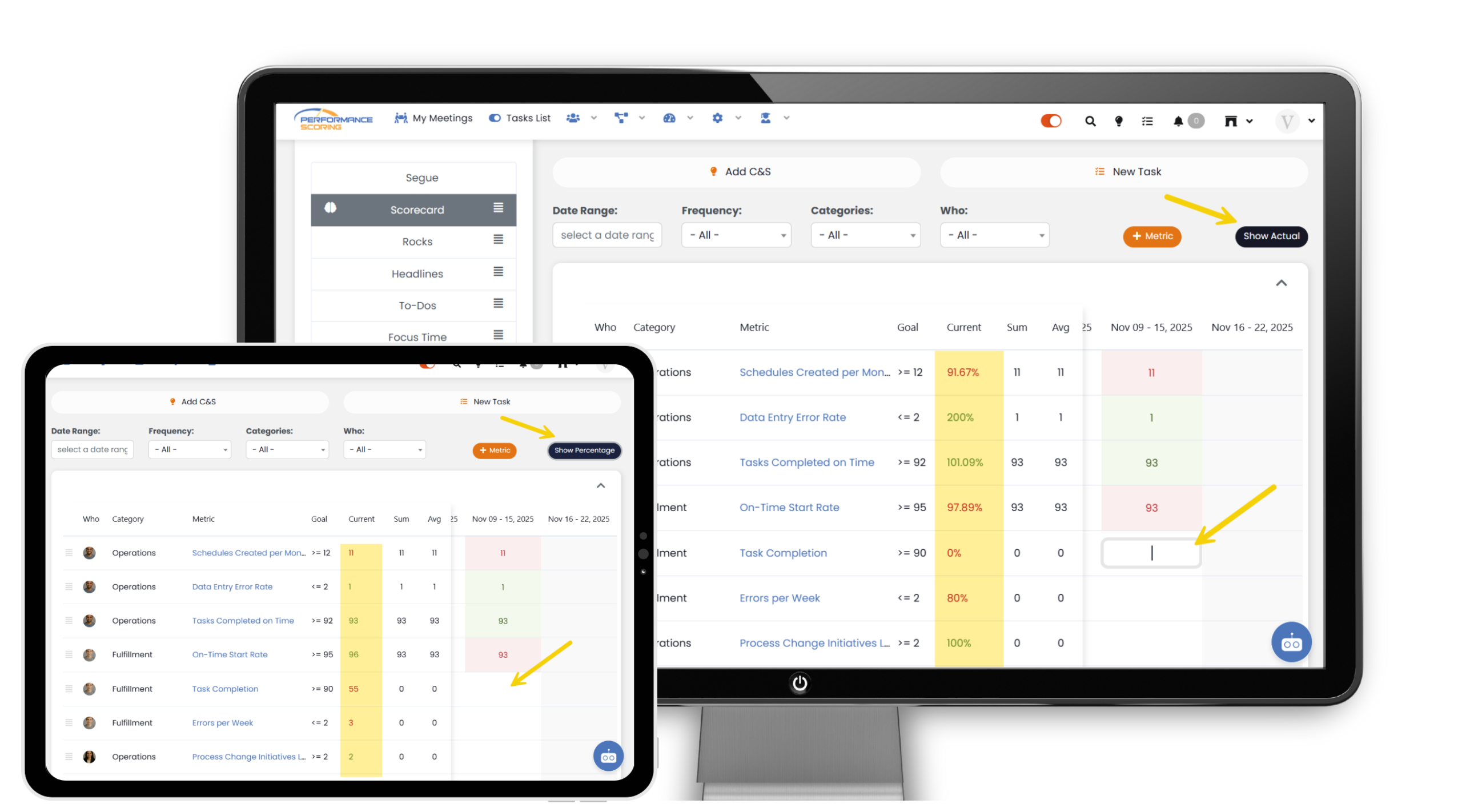 Above the Scorecard, you will see filters for Date Range, Frequency, Category, and Who that allow you to quickly view different variations of the Scorecard.