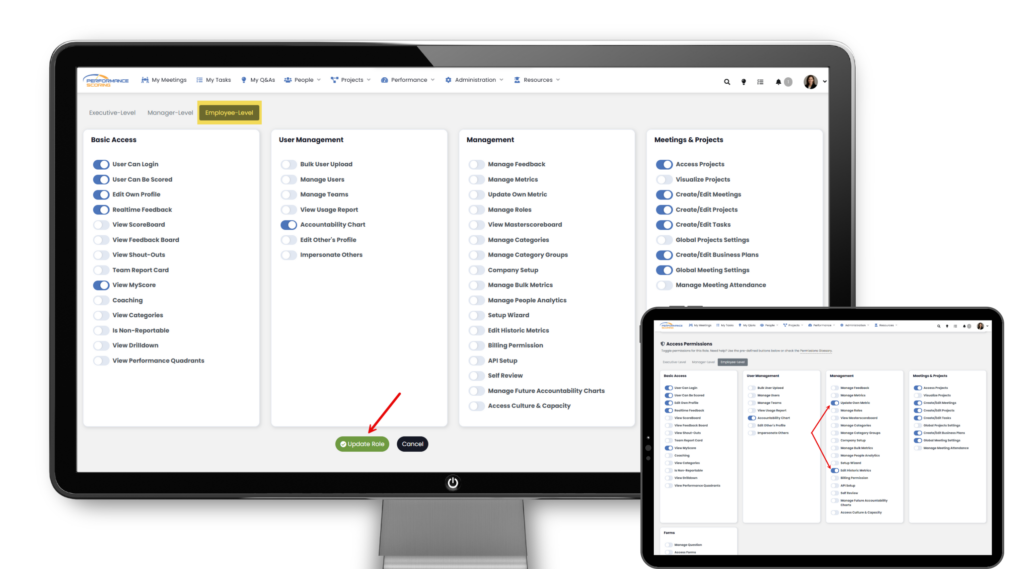 Role permissions determine what users can see and access within Performance Scoring. To review permissions, navigate to the role or user settings and open the permissions view to see which features, tools, and sections are enabled. This visibility helps ensure users have the right level of access based on their responsibilities.
