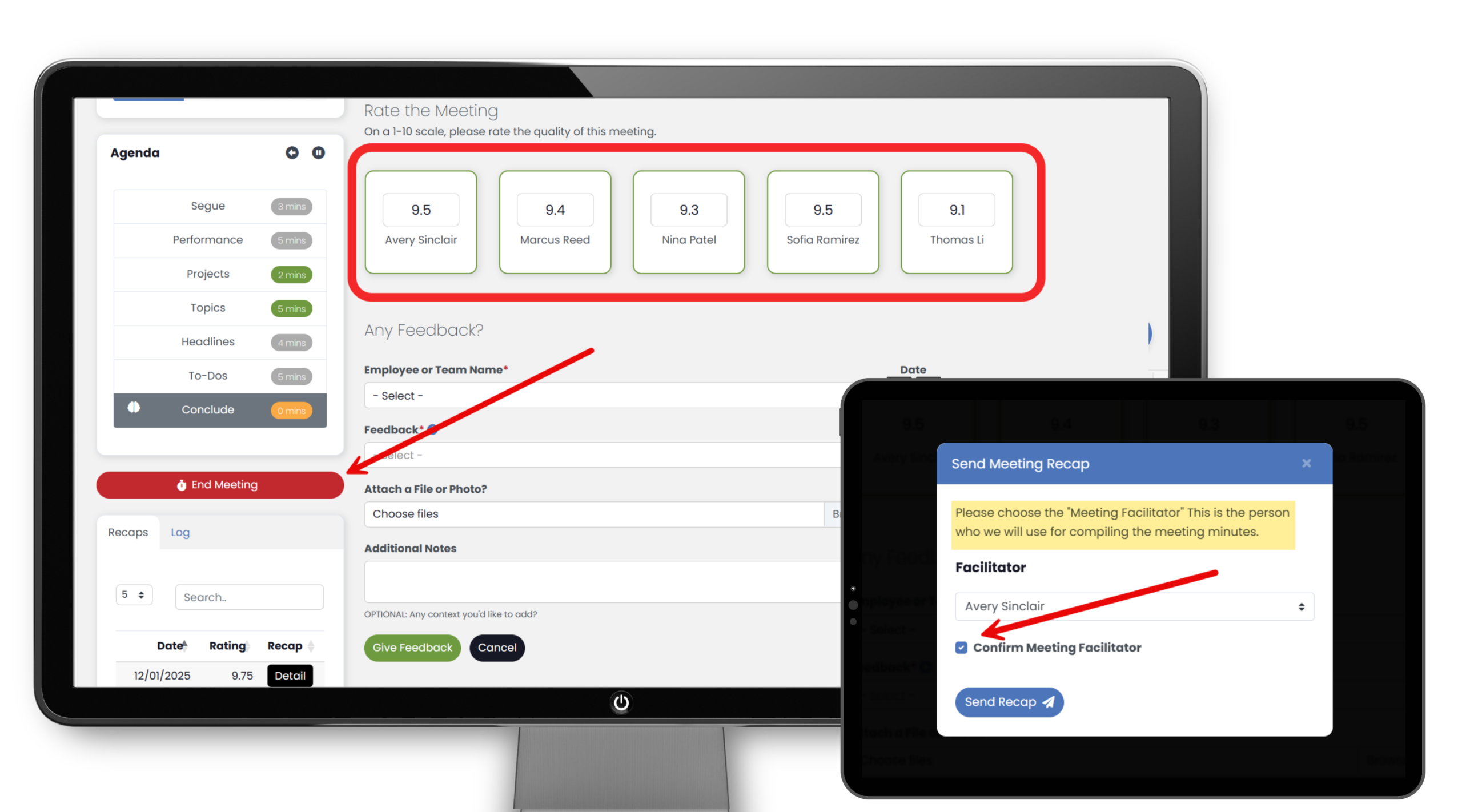 Don’t forget to send the meeting overview to yourself and all attendees. Select the meeting Facilitator, confirm by checking the acknowledgment box, and then click Send Recap to share the meeting summary and action items.