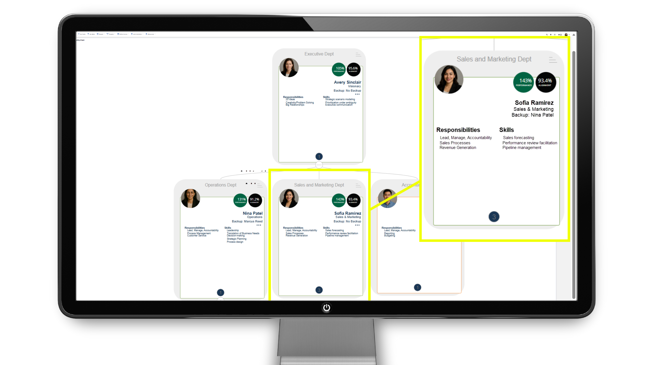 On the Accountability Chart, each user tile displays key information at a glance, including the user’s name, role or seat, and primary responsibilities. The tile provides quick visibility into who owns what within the organization and how roles are structured. This makes it easy to understand accountability and reporting relationships across the team.