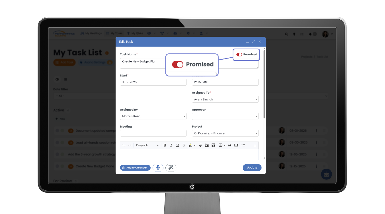 Promised Tasks reinforce discipline and accountability between meetings.