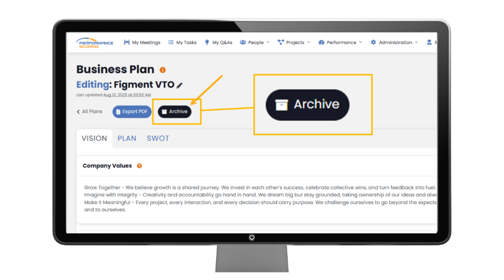 When treated as a living document, your Business Plan becomes more than a statement of intent — it becomes the roadmap that guides every meeting, project, and performance conversation inside Performance Scoring.