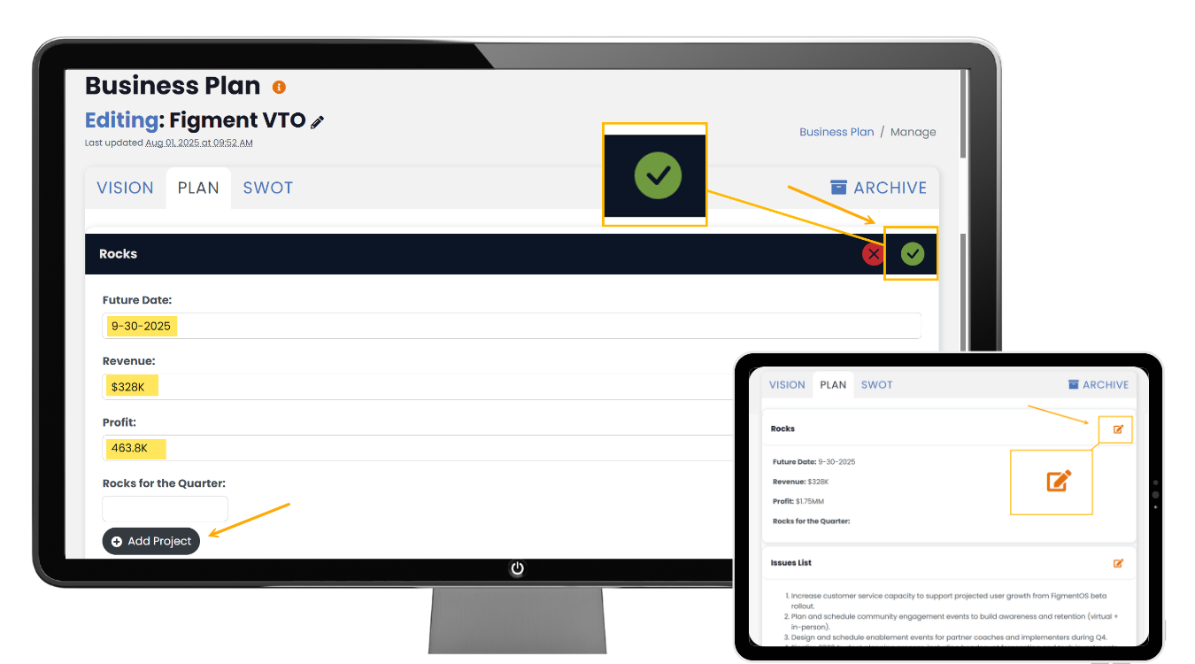 Click the Edit (pencil) icon next to the section you want to update (Vision, 1-Year Plan, Quarterly Priorities, Scorecard, SWOT, etc.).
