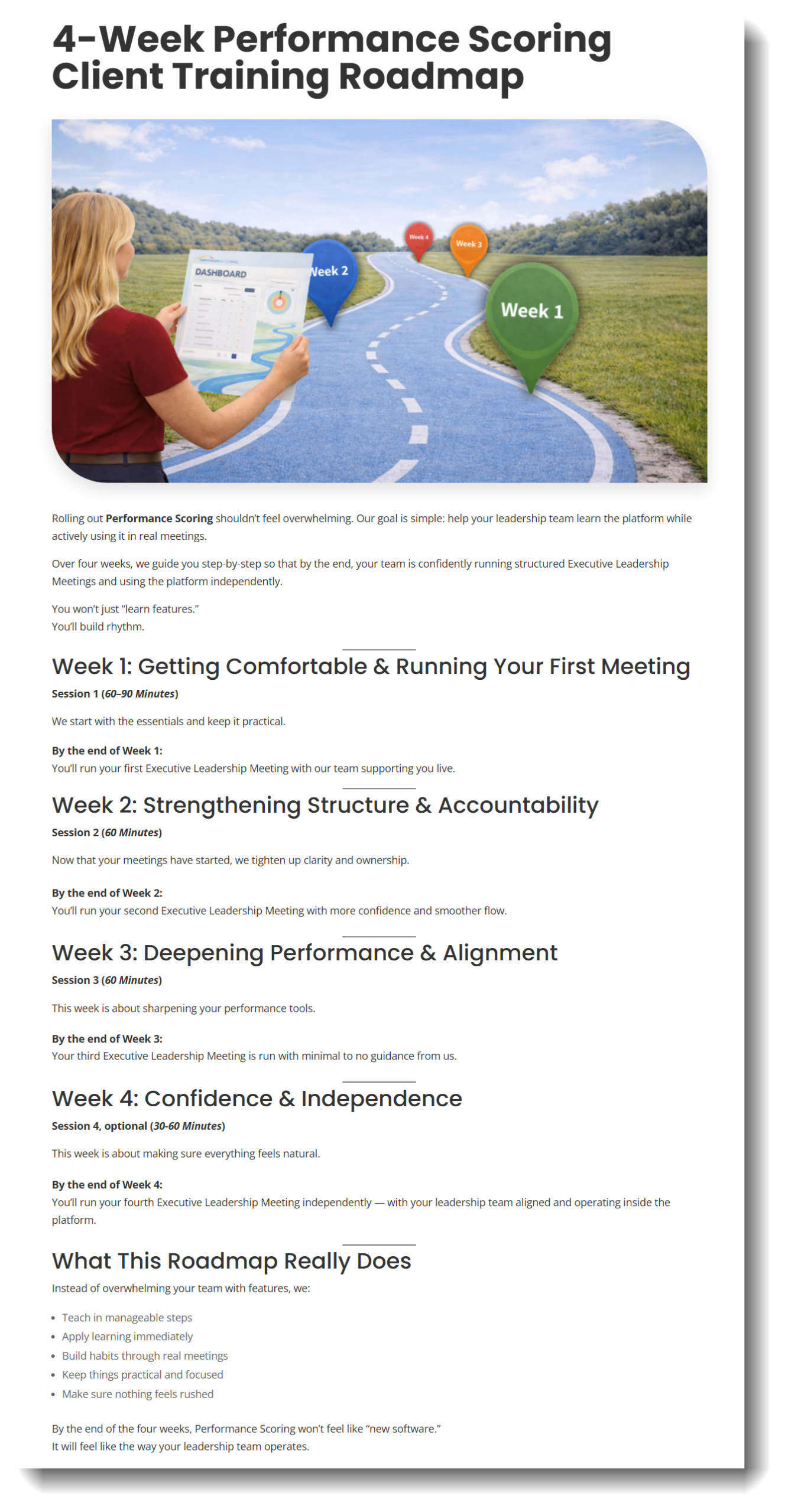 • Provide a 4-week training roadmap along with structured training materials so your organization can quickly roll out Performance Scoring company-wide